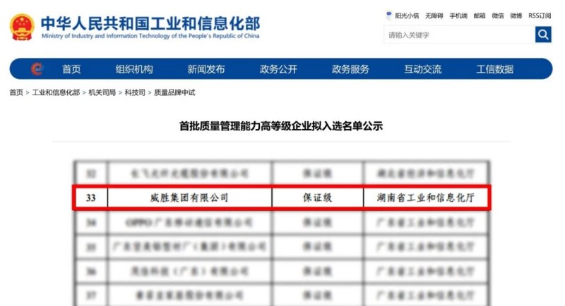 喜讯|威胜集团荣膺工信部首批质量管理能力高等级企业湖南省首家上榜企业彰显实力