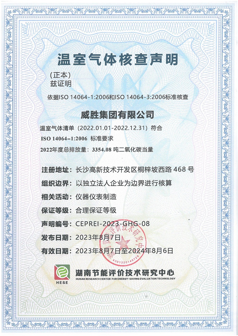 近日,通过湖南节能评价技术研究中心的核查,依据ISO14064-1:2006和ISOISO14064-3:2006标准,威胜集团有限公司的温室气体清单(2022.01.01-2022.12.31)符合ISO14064-1:2006标准要求,在2022年度总排放量为:3354.08吨二氧化碳当量。顺利获得温室气体核查声明。
