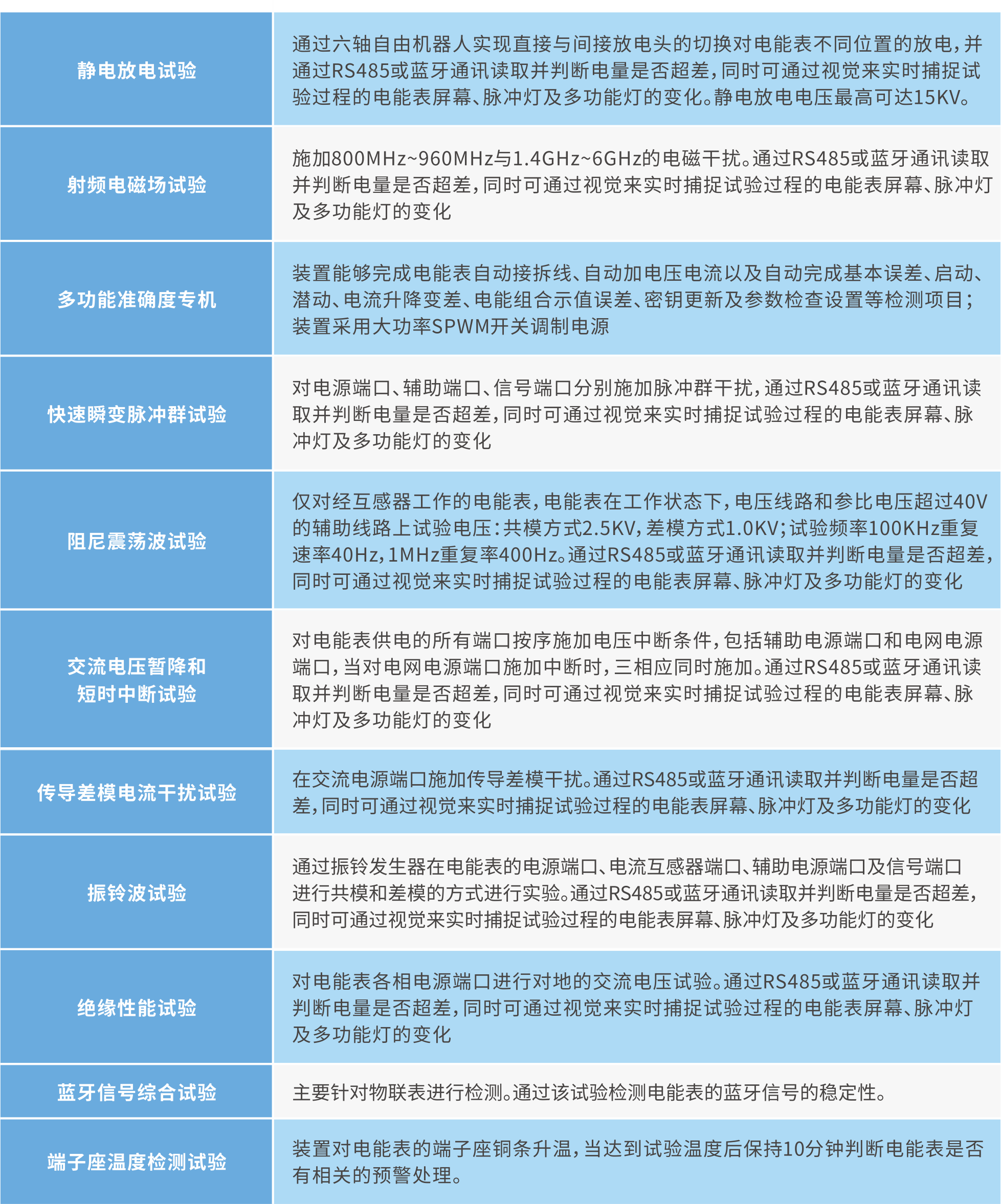 本产品主要面向电力行业客户、电能表制造厂家等,实现小批量的抽检或全检的全性能自动化检定。根据客户需求综合考虑总体布局、生产产能、工位节拍、物流传输等因素,采用标准化、模块化设计,选用多种移载机构及各种自动化装置,实现电能表的全性能检测的全过程自动化。自动化流水线生点将对其电磁兼容(EMC)相关的实验、多功能准确度等进行全方位的检测。兼容单三电能表及采集终端的检测。