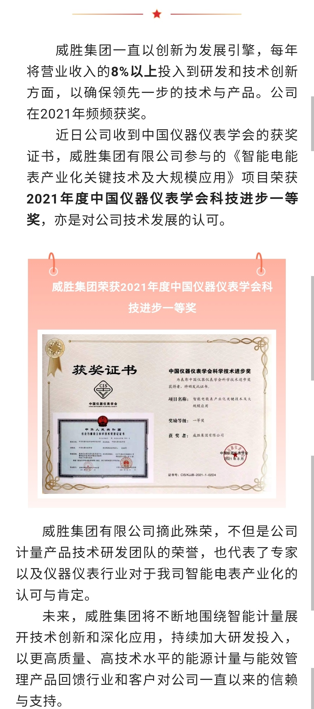 新年伊始,双喜临门!威胜集团单相智能物联电能通过国网计量中心全性能检测认证及荣获2021年度中国仪器仪表学会科技进步一等奖!