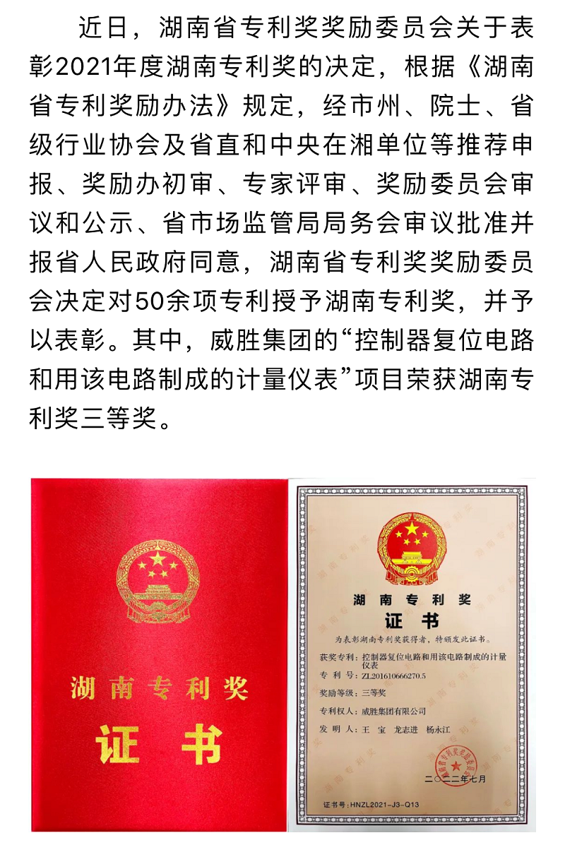 【喜讯】威胜集团荣获2021年度湖南专利奖