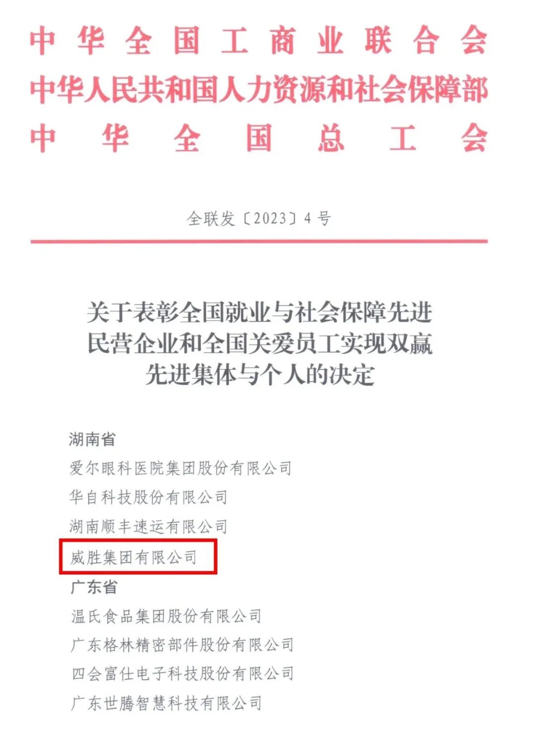 近日,全国工商业联合会、人力资源和社会保障部、全国总工会联合发布“全国就业与社会保障先进民营企业和全国关爱员工实现双赢先进集体与个人”表彰名单,经层层推荐、严格审核,威胜集团荣获“全国就业与社会保障先进民营企业”荣誉称号!