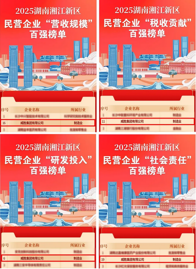近日,湖南湘江新区公布了2025湖南湘江新区民营企业“营收规模”“税收贡献”“研发投入”“社会责任”四类百强榜单,威胜集团有限公司全部上榜。